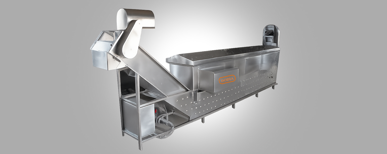 A continuous conveyor blancher is a specialized machine used in food processing to prepare vegetables before dehydration or freezing by blanching them in hot water, typically maintained at 80–90 °C, where a conveyor belt carries the vegetables through the water for a controlled time to inactivate spoilage enzymes while retaining color, texture, flavor, and nutritional quality; this process ensures uniform, efficient handling of large volumes, preserves product quality, and prepares vegetables for longer shelf life in dehydration or freezing applications, making it essential in food dehydration plants, frozen vegetable processing lines.